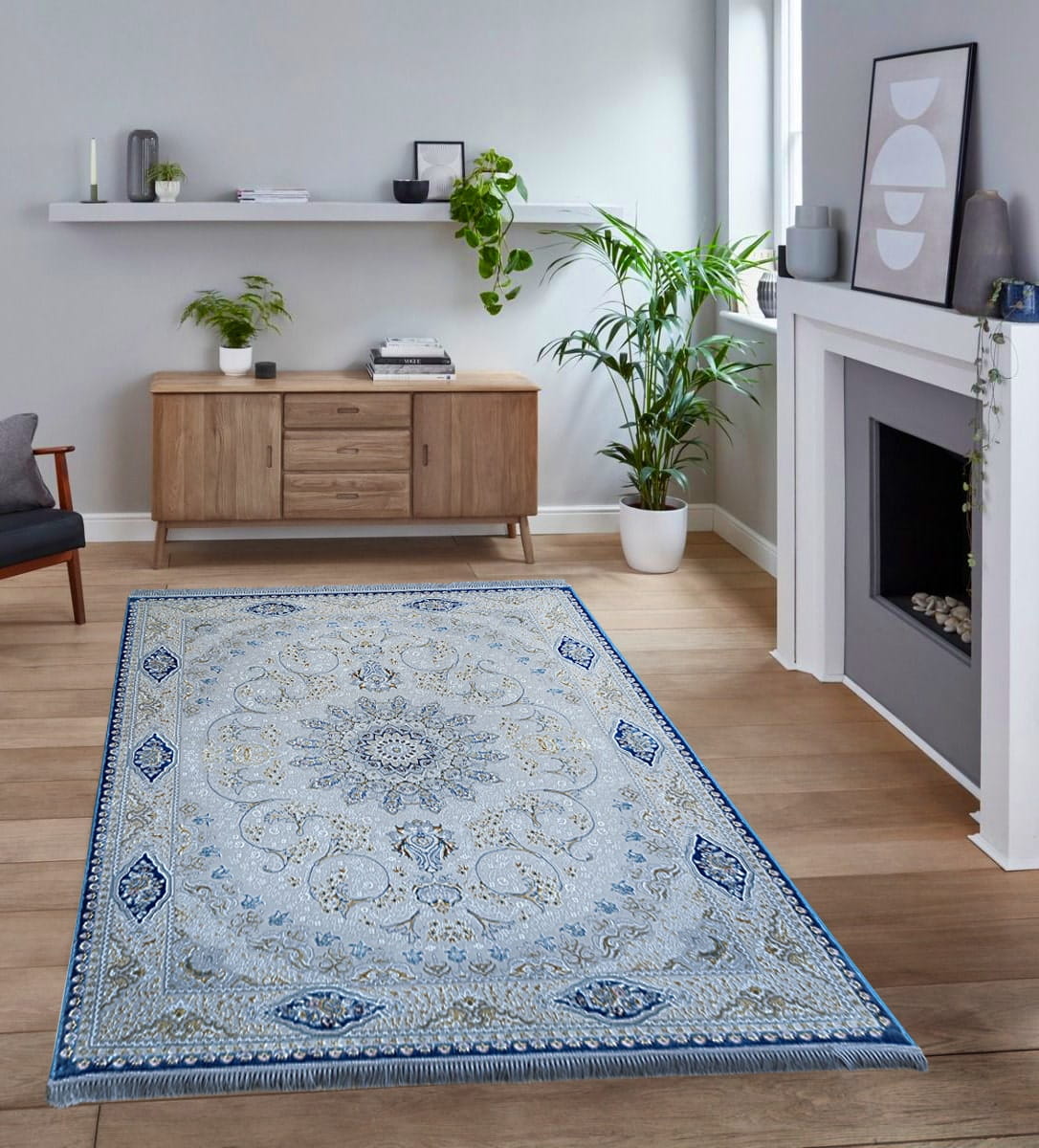 Jego misternie wytkany wzór, łączący klasyczną rozetę z roślinnymi motywami, wprowadza do wnętrza ponadczasowy styl oraz elegancję, przyciągając wzrok gości od samego wejścia. Naturalna szara kolorystyka z niebieskimi akcentami ociepla przestrzeń, nadając jej wyjątkowy charakter.
