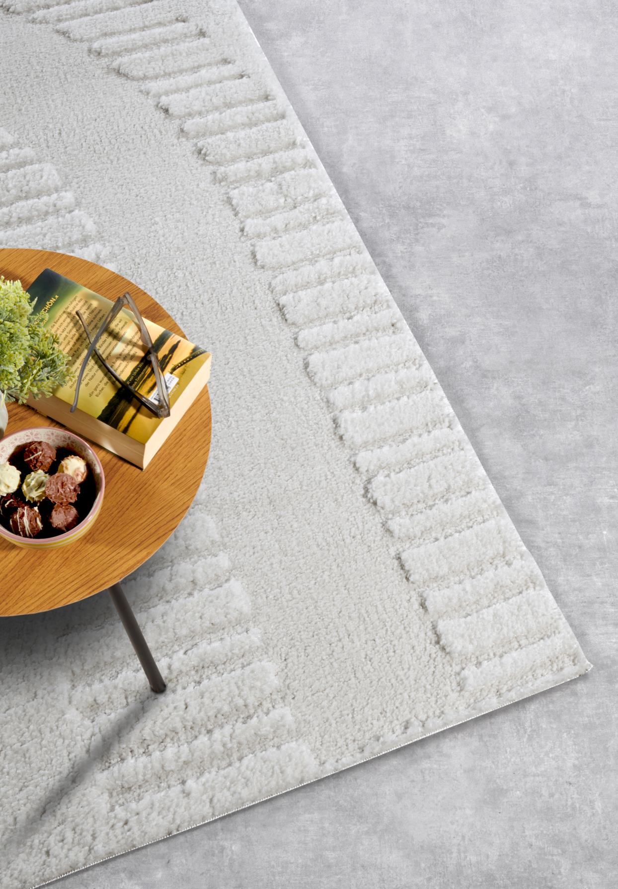 Połączenie geometrycznego motywu z efektem 3D sprawia, że dywan idealnie wpasowuje się w różnorodne aranżacje – zarówno nowoczesne, jak i tradycyjne. Ciepła kremowa kolorystyka wprowadza przytulność, tworząc komfortową atmosferę w Twoim domu.