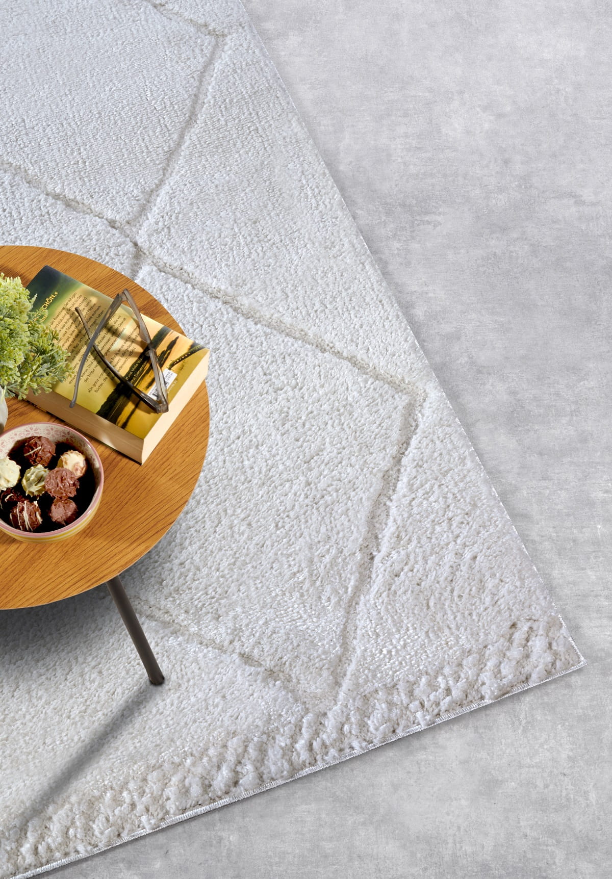 Połączenie geometrycznego motywu z efektem 3D sprawia, że dywan idealnie wpasowuje się w różnorodne aranżacje – zarówno nowoczesne, jak i tradycyjne. Ciepła kremowa kolorystyka wprowadza przytulność, tworząc komfortową atmosferę w Twoim domu.
