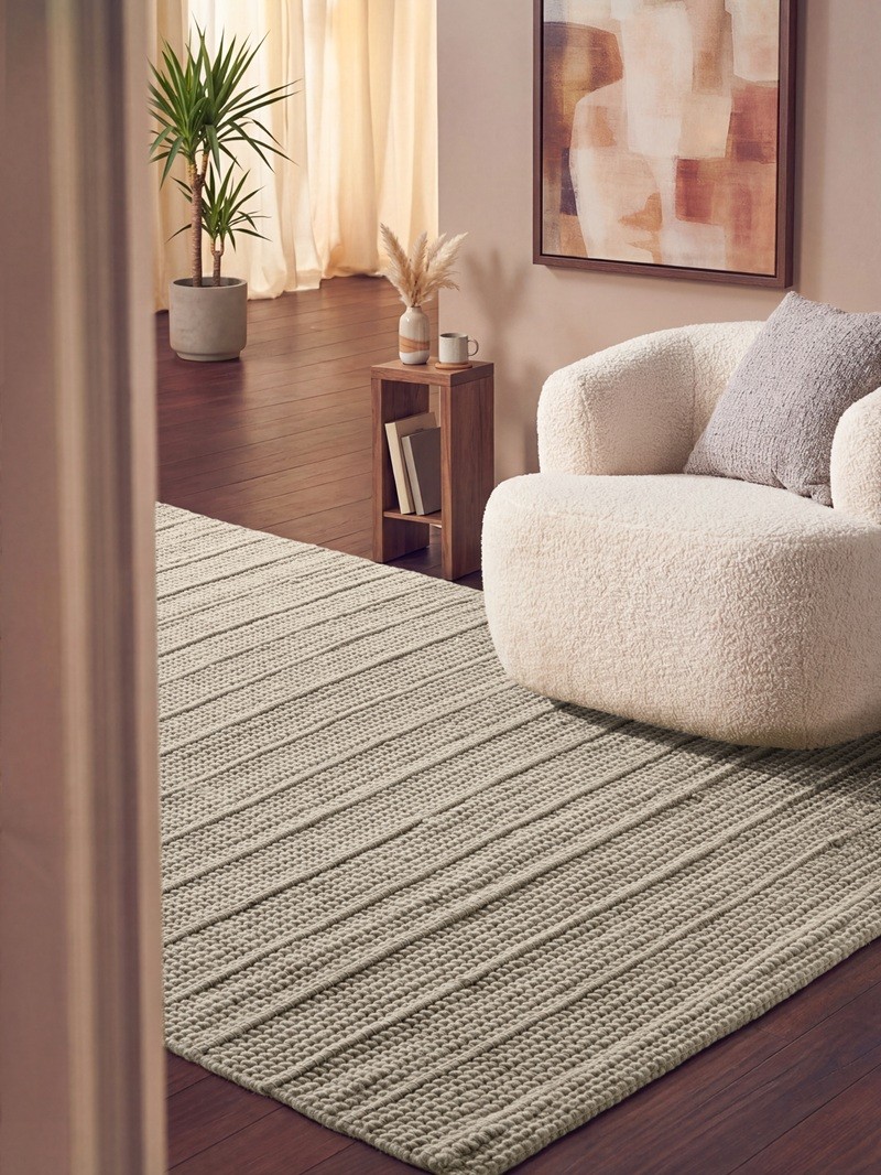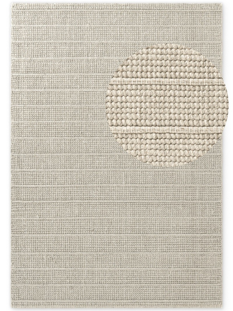 Powierzchnia dywanu składa się z regularnych poziomych pasów, w których naprzemiennie zastosowano dwa rodzaje struktury. Pierwszy z nich tworzy gęsty, drobny splot, przypominający delikatną tkaninę o jednolitej, zwartej fakturze. Drugi natomiast wyróżnia się bardziej wypukłą, plecioną strukturą, w której widoczne są większe, wyraźniejsze oczka przędzy. Dzięki temu na powierzchni dywanu powstaje subtelny efekt trójwymiarowości, który zmienia się w zależności od kąta padania światła.