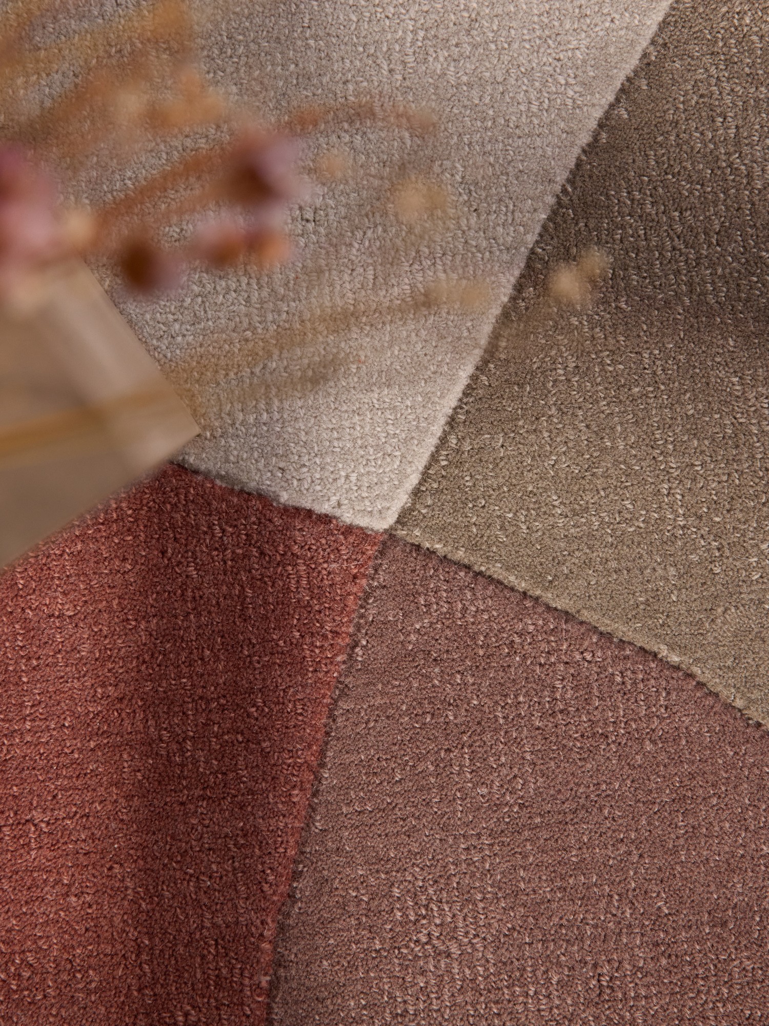 Efekt wysokiego i niskiego runa podkreśla strukturę dywanu, a stonowana paleta kolorów wprowadza do wnętrza ciepło i elegancję. Kolory są miękko zestawione i płynnie przechodzą jeden w drugi, co tworzy spokojny i elegancki efekt wizualny.
